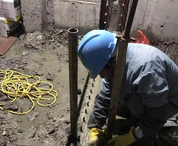 10、注浆 首先用手掀式注浆泵向引水管压水,然后再压注水溶性聚氨酯浆液(或其他化学灌浆材料)。待浆液固化后,用小刀割掉预埋引水管,再用双快水泥封闭。
